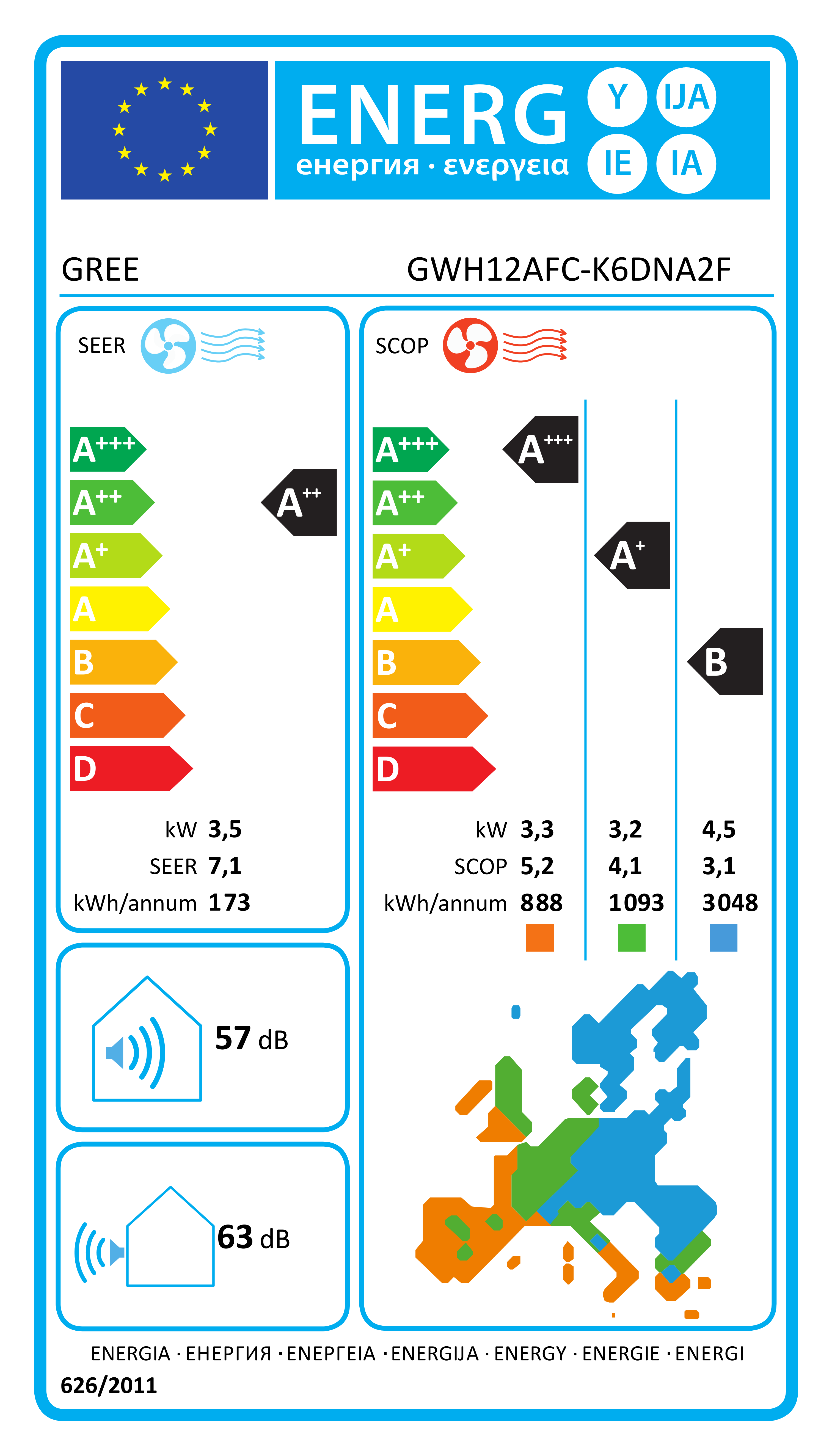 Vanjska jedinica split sustava (reverzibilna dizalica topline), zaštićena od vremenskih utjecaja, s ugrađenim kompresorom s inverterskom regulacijom snage i potrošnje, kit-om za rad na niskim temperaturama, te svim potrebnim elementima za zaštitu, kontrolu i regulaciju uređaja i funkcionalan rad, sljedećih tehničkih značajki: nominalni učinak hlađenja: Qh= 3.51 kW učinak hlađenja (min. - max.) Qh = 0.9 - 4.4 kW apsorbirana snaga u hlađenju: 0.962 kW energetski razred u hlađenju: A++ sezonska energetska učinkovitost: SEER = 7.1 nominalni učinak grijanja: Qg = 3.81 kW učinak grijanja (min. - max.): Qg = 0.9 - 4.7 kW apsorbirana snaga u grijanju: 0.953 kW energetski razred u grijanju: A+ sezonska energetska učinkovitost: SCOP = 4.1 godišnja potrošnja u hlađenju: 173 kWh/god godišnja potrošnja u grijanju: 1093 kWh/god dimenzije: V × Š × D = 555 x 732 x 330 mm masa: 24.5 kg protok zraka - hlađenje: 32.5 m3/min protok zraka - grijanje: 32.5 m3/min razina zvučnog tlaka (SPL) - hlađenje: 52 dB(A) razina zvučnog tlaka (SPL) - grijanje: 52 dB(A) razina zvučne snage (PWL) - hlađenje: 63 dB(A) razina zvučne snage (PWL) - grijanje: 63 dB(A) područje hlađenja: -15°C do 50°C područje grijanja: -25°C do 30°C radni medij: R32 napajanje: 220 - 240 / 1 faza / 50 Hz maksimalna dozvoljena duljina cijevnog razvoda: 15 m priključak - tekuća faza: 6.35 mm priključak - plinovita faza: 9.52 mm maksimalna dozvoljena visina cijevnog razvoda: 10 m Proizvod: GREE Tip: GWH12AFC-K6DNA2F/O