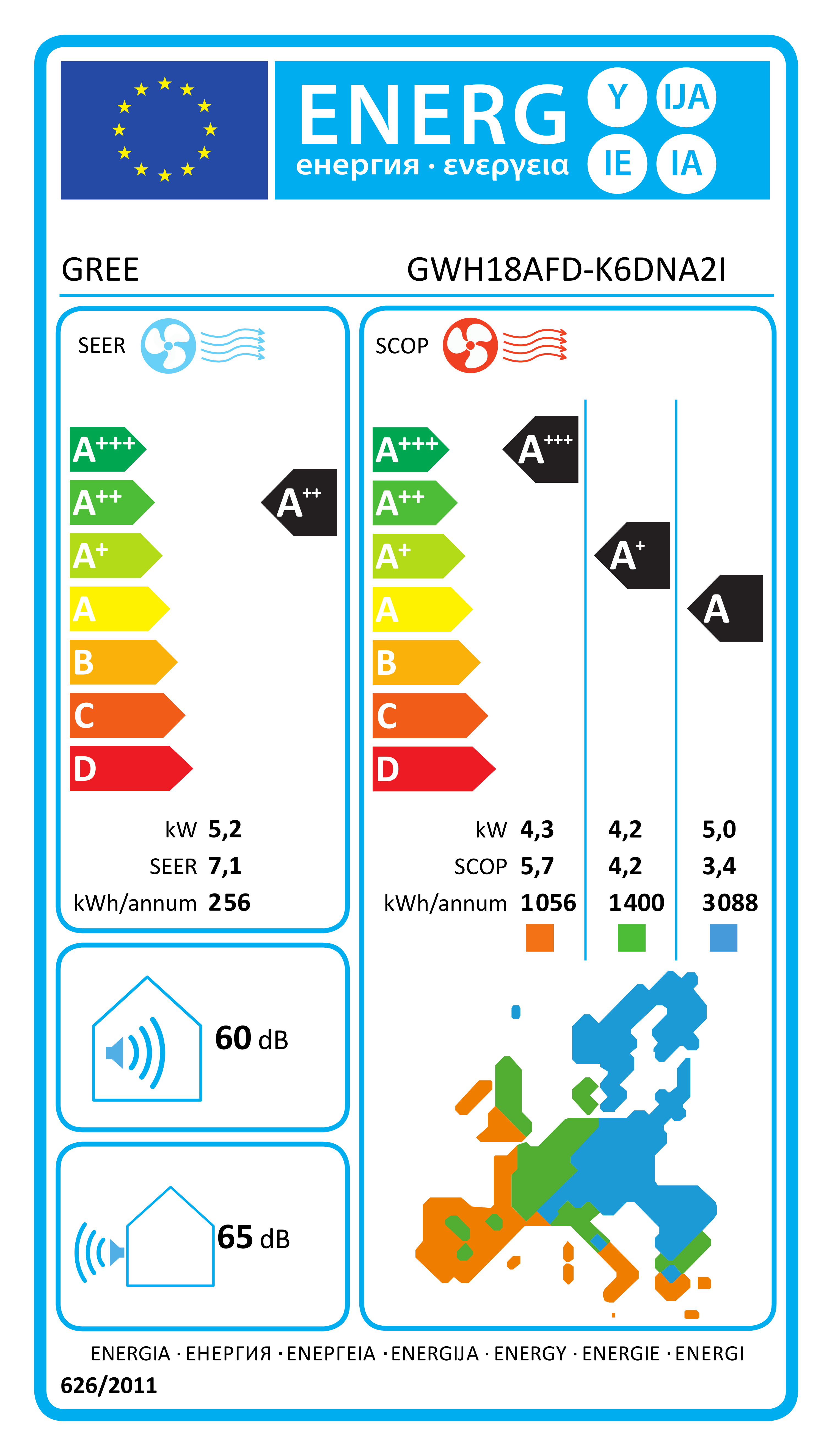Vanjska jedinica split sustava (reverzibilna dizalica topline), zaštićena od vremenskih utjecaja, s ugrađenim kompresorom s inverterskom regulacijom snage i potrošnje, kit-om za rad na niskim temperaturama, te svim potrebnim elementima za zaštitu, kontrolu i regulaciju uređaja i funkcionalan rad, sljedećih tehničkih značajki: nominalni učinak hlađenja: Qh= 5.2 kW učinak hlađenja (min. - max.) Qh = 1 - 6.1 kW apsorbirana snaga u hlađenju: 1.576 kW energetski razred u hlađenju: A++ sezonska energetska učinkovitost: SEER = 7.1 nominalni učinak grijanja: Qg = 5.6 kW učinak grijanja (min. - max.): Qg = 1.1 - 6.6 kW apsorbirana snaga u grijanju: 1.436 kW energetski razred u grijanju: A+ sezonska energetska učinkovitost: SCOP = 4.2 godišnja potrošnja u hlađenju: 256 kWh/god godišnja potrošnja u grijanju: 1400 kWh/god dimenzije: V × Š × D = 555 x 802 x 350 mm masa: 30.5 kg protok zraka - hlađenje: 36.67 m3/min protok zraka - grijanje: 36.67 m3/min razina zvučnog tlaka (SPL) - hlađenje: 56 dB(A) razina zvučnog tlaka (SPL) - grijanje: 56 dB(A) razina zvučne snage (PWL) - hlađenje: 65 dB(A) razina zvučne snage (PWL) - grijanje: 65 dB(A) područje hlađenja: -15°C do 50°C područje grijanja: -25°C do 30°C radni medij: R32 napajanje: 220 - 240 / 1 faza / 50 Hz maksimalna dozvoljena duljina cijevnog razvoda: 25 m priključak - tekuća faza: 6.35 mm priključak - plinovita faza: 12.7 mm maksimalna dozvoljena visina cijevnog razvoda: 10 m Proizvod: GREE Tip: GWH18AFD-K6DNA2I/O