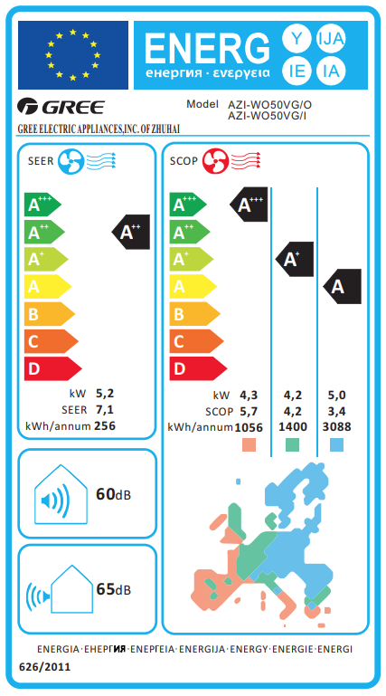 Vanjska jedinica split sustava (reverzibilna dizalica topline), zaštićena od vremenskih utjecaja, s ugrađenim kompresorom s inverterskom regulacijom snage i potrošnje, kit-om za rad na niskim temperaturama, te svim potrebnim elementima za zaštitu, kontrolu i regulaciju uređaja i funkcionalan rad, sljedećih tehničkih značajki: nominalni učinak hlađenja: Qh= 5.2 kW učinak hlađenja (min. - max.) Qh = 1 - 6.1 kW apsorbirana snaga u hlađenju: 1.576 kW energetski razred u hlađenju: A++ sezonska energetska učinkovitost: SEER = 7.1 nominalni učinak grijanja: Qg = 5.6 kW učinak grijanja (min. - max.): Qg = 1.1 - 6.6 kW apsorbirana snaga u grijanju: 1.436 kW energetski razred u grijanju: A+ sezonska energetska učinkovitost: SCOP = 4.2 dimenzije: V × Š × D = 555 x 802 x 350 mm masa: 30.5 kg protok zraka - hlađenje: 36.67 m3/min protok zraka - grijanje: 36.67 m3/min razina zvučnog tlaka (SPL) - hlađenje: 56 dB(A) razina zvučnog tlaka (SPL) - grijanje: 56 dB(A) razina zvučne snage (PWL) - hlađenje: 65 dB(A) razina zvučne snage (PWL) - grijanje: 65 dB(A) područje hlađenja: -15°C do 50°C područje grijanja: -25°C do 30°C radni medij: R32 napajanje: 220 - 240 / 1 faza / 50 Hz maksimalna dozvoljena duljina cijevnog razvoda: 25 m priključak - tekuća faza: 6.35 mm priključak - plinovita faza: 12.7 mm maksimalna dozvoljena visina cijevnog razvoda: 10 m Proizvod: AZURI Tip: AZI-WO50VG/O